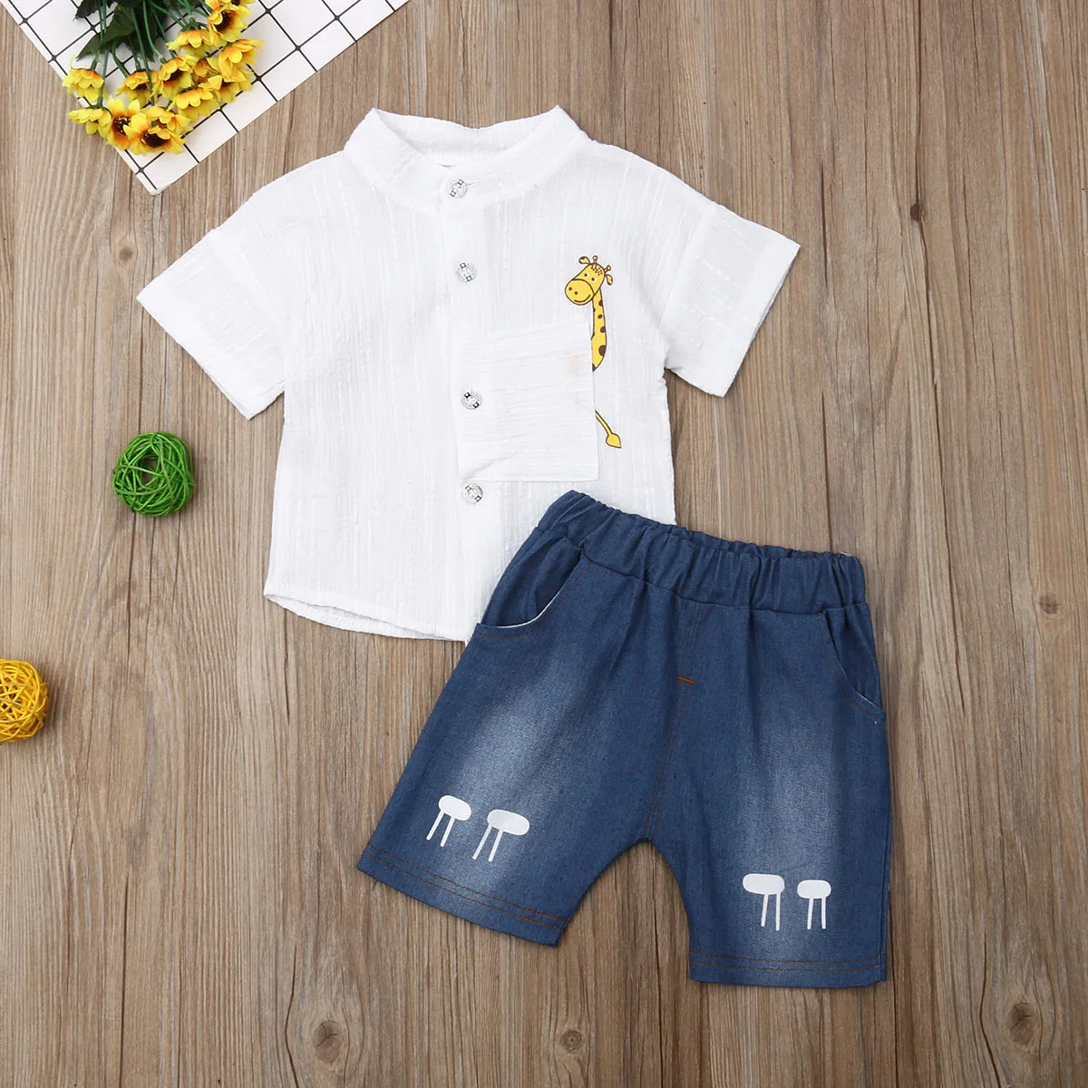 Cheap Price of 2PCS Kid Baby Boy Cotton Tops Gentleman Sort Sleeve Giraffe Shirt Jean Shorts Summer Formal Clothes