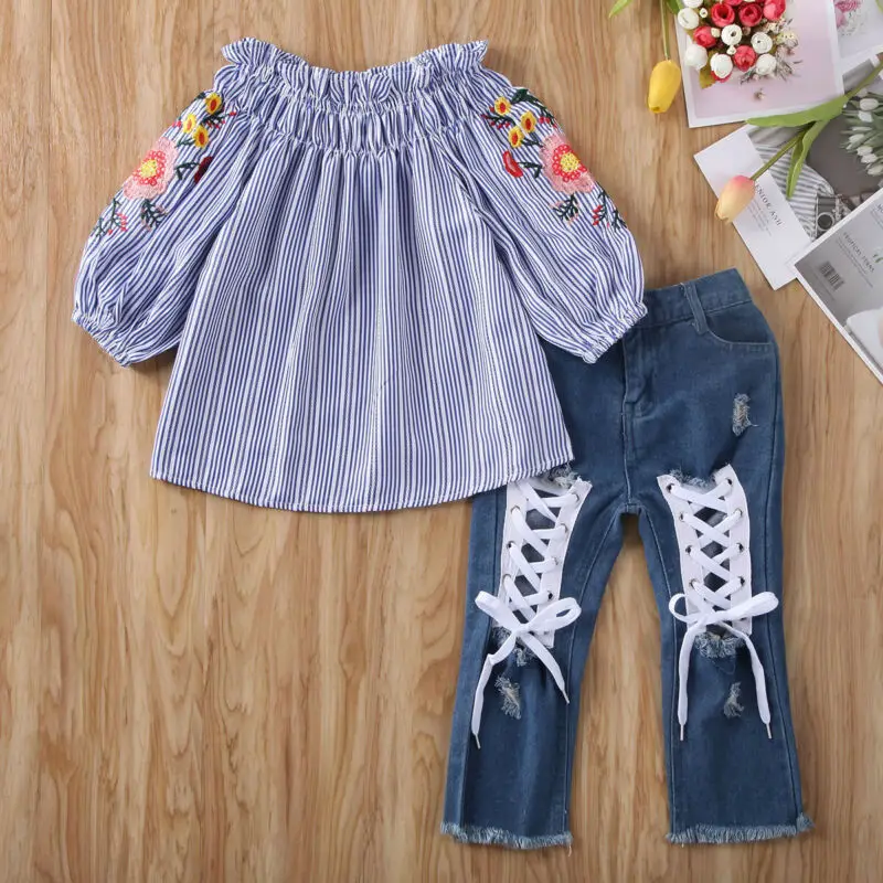 Special Price for Imcute Spring Autumn Fashion Toddler Girls Kids Flower Off Shoulder Tops Denim Trousers Jeans Cloth