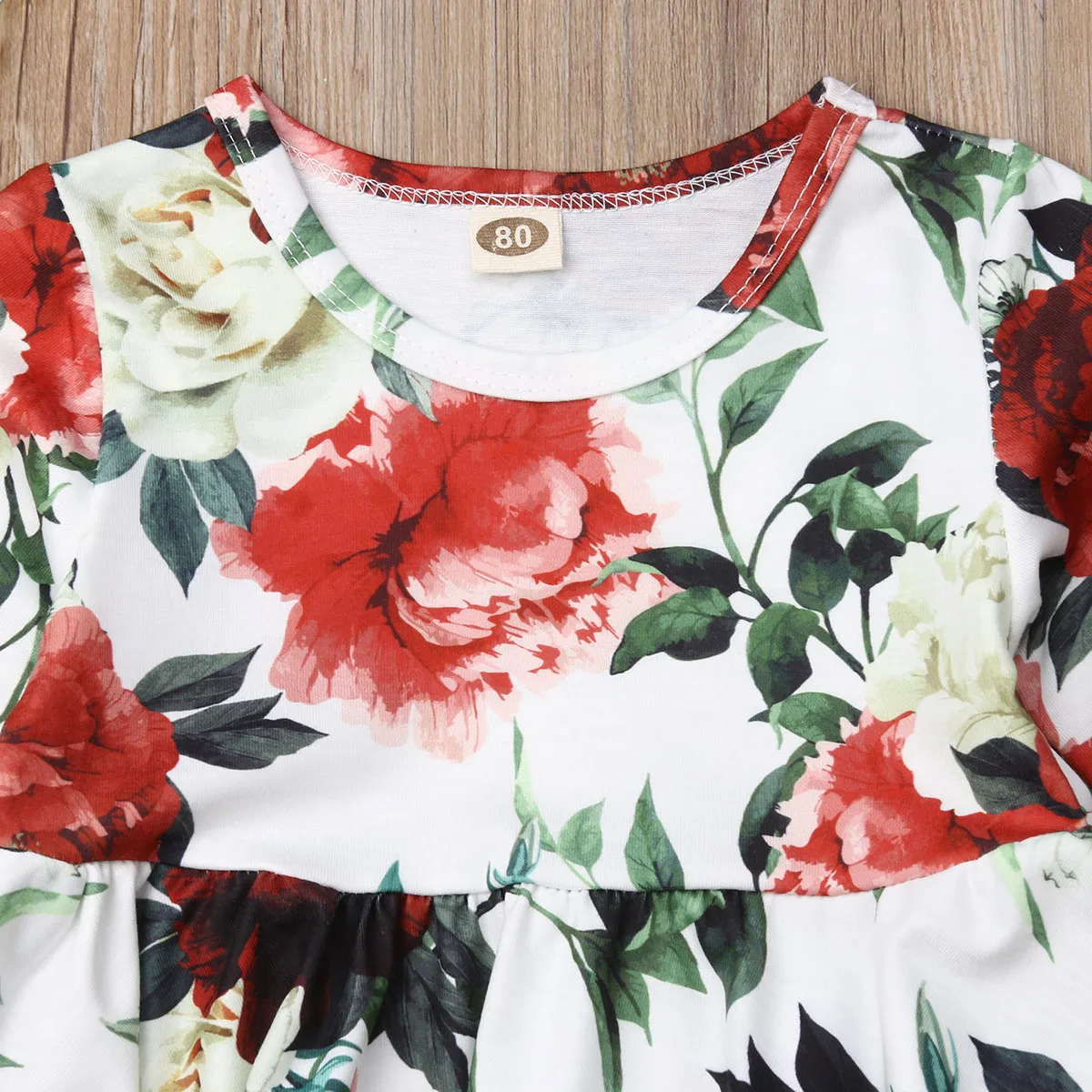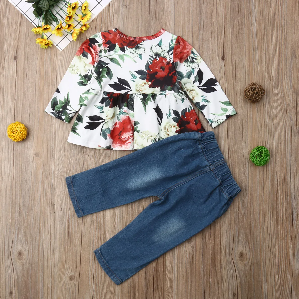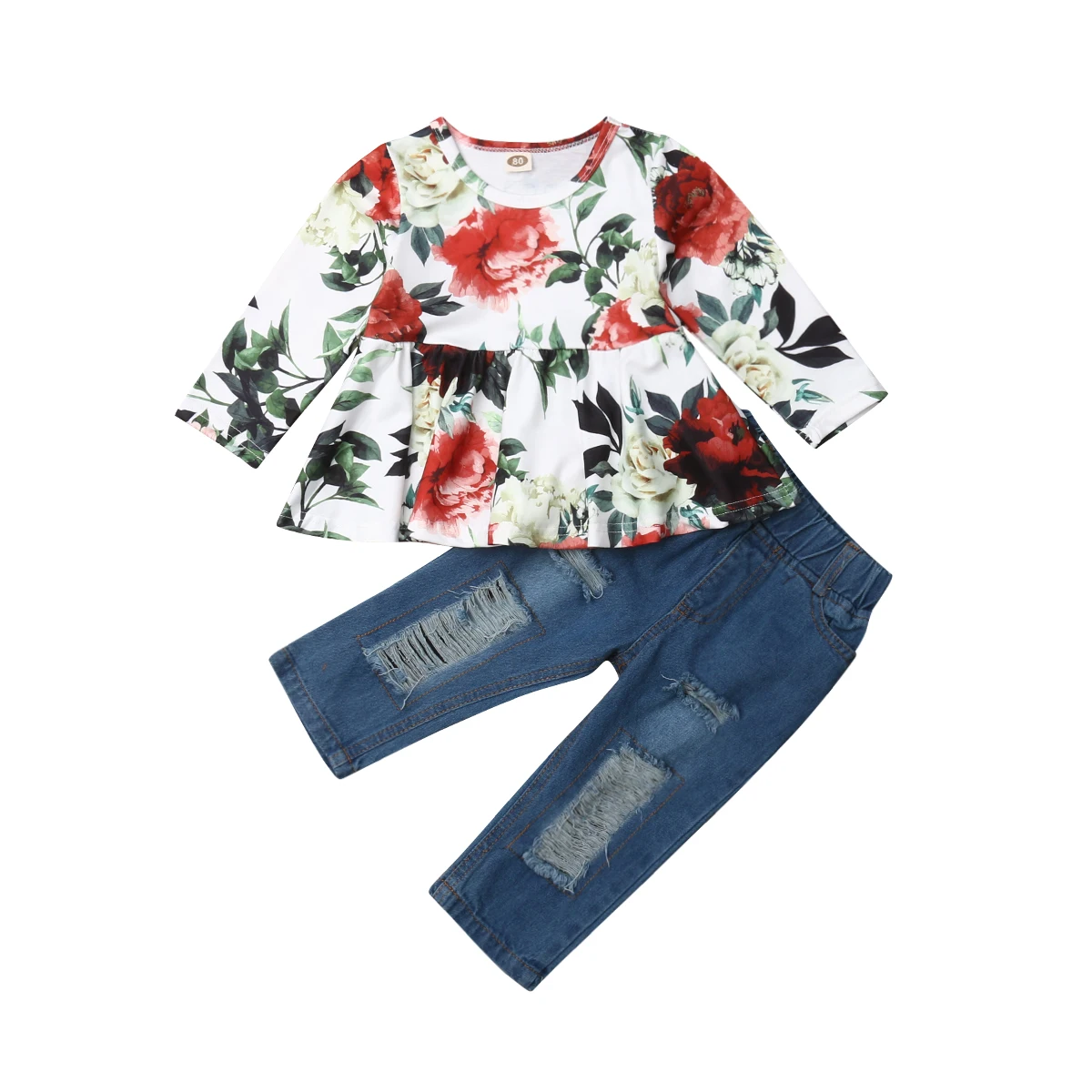 Limited Offer for Princess Kids Baby Girls Clothes Sets Fashion Floral Print Dress Tops+Ripped Jeans Denim Pants 2Pcs