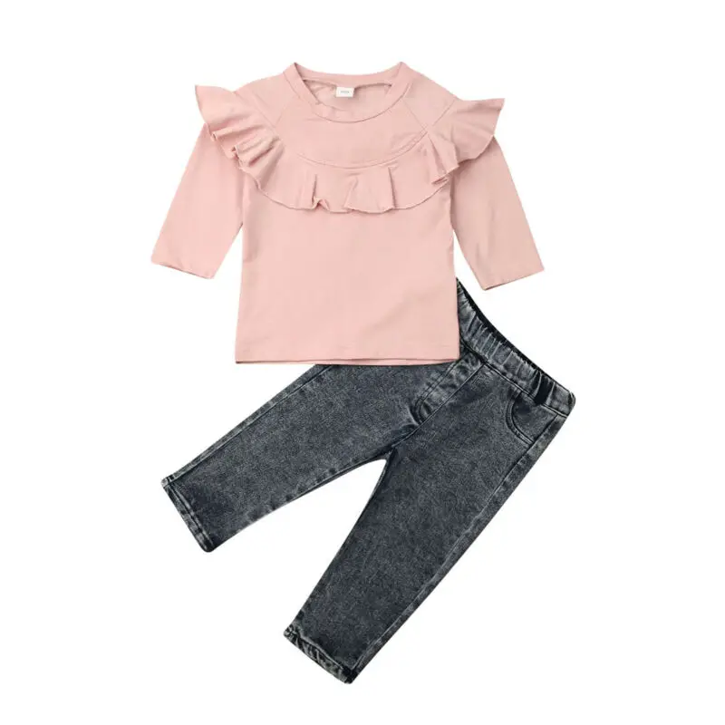 Special Offer for Toddler Baby Girls Autumn Outfits Long Sleeve Ruffle Solid Color Cotton Tops + Denim Pants Jeans Ca
